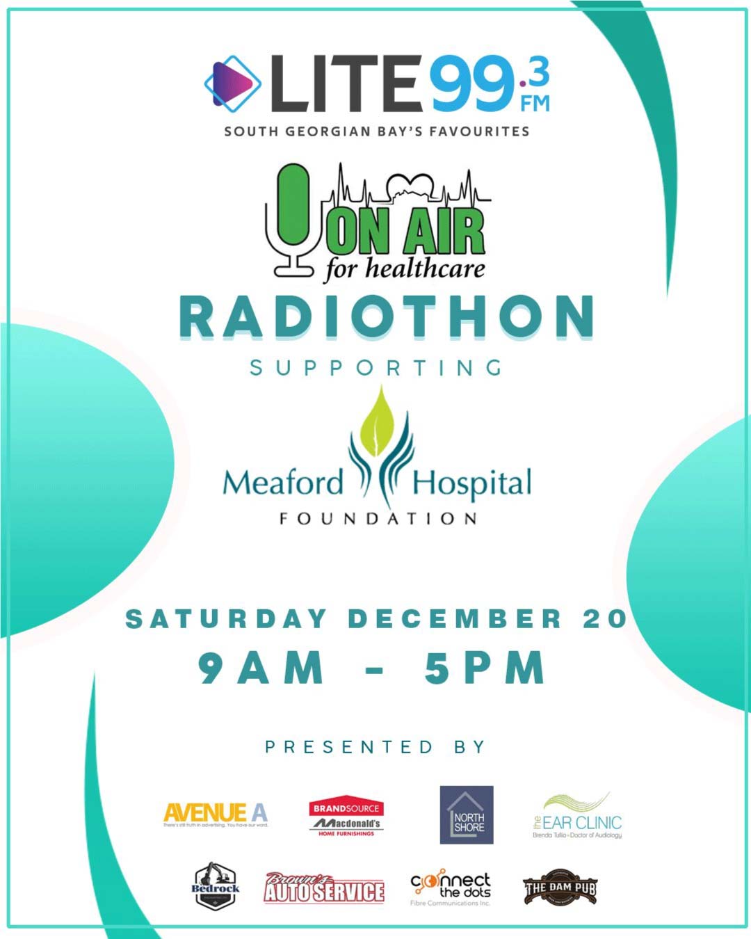 Lite 99.3 is excited to host “On Air for Healthcare”, a Radiothon for the Meaford Hospital Foundation on Saturday, December 20, from 9:00am. to 5:00pm. The event, will raise funds for essential medical equipment for Meaford Hospital.